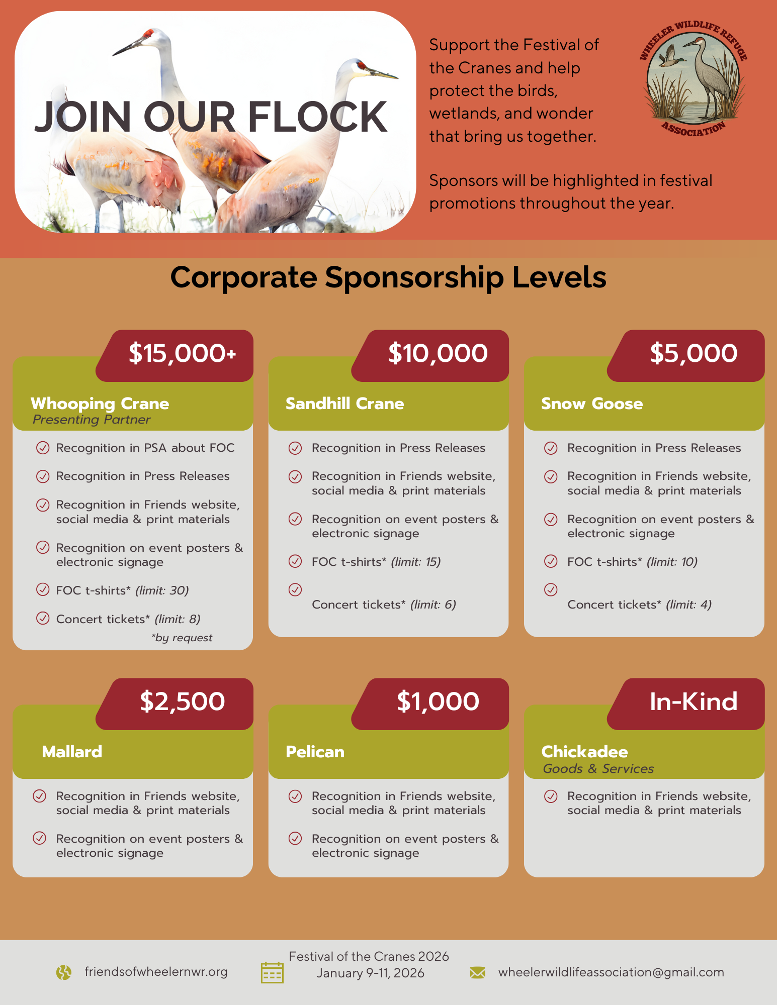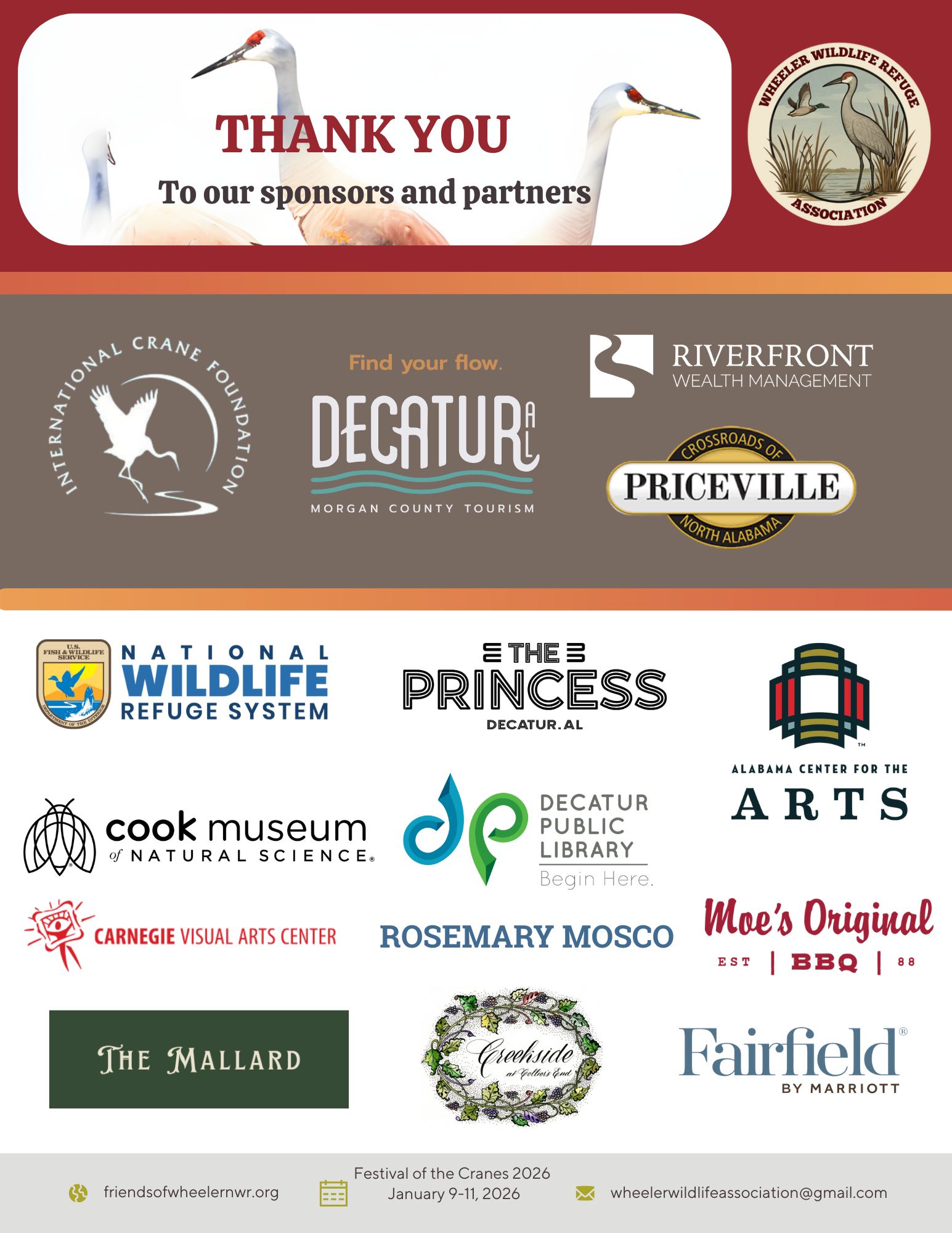 Each winter, tens of thousands of sandhill cranes and the occasional endangered whooping crane descend on Wheeler National Wildlife Refuge, transforming North Alabama into one of the Southeast’s most inspiring wildlife spectacles. To spotlight and celebrate this migration, we invite you to support the 2026 Festival of the Cranes, taking place Jan. 9-11 in downtown Decatur and at the Refuge Visitors Center.